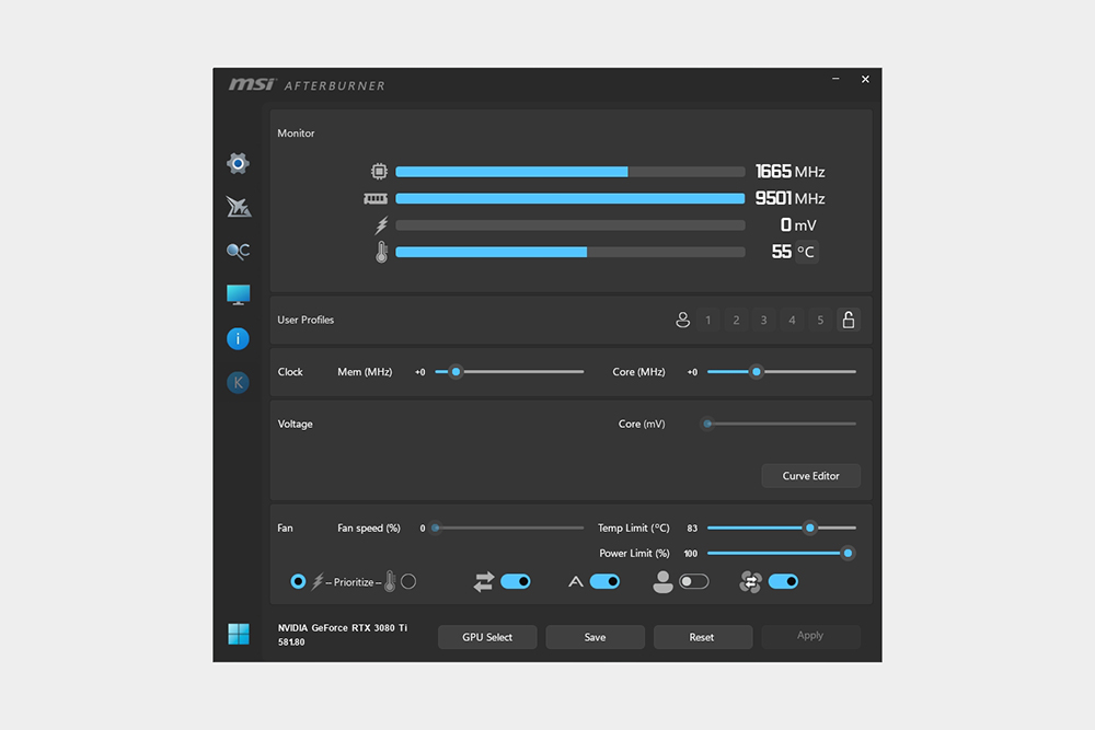 MSI Afterburner is the world’s most recognized and widely used graphics card overclocking utility. It provides detailed overview of your hardware and comes with some additional features like customizing fan profiles, benchmarking and video recording.