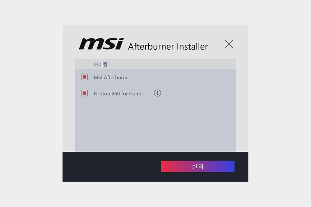 MSI 애프터버너는 무료로 제공되는 소프트웨어이기 때문에 설치할 때 광고가 포함되어 있는데요. Norton 360 for Gmaer가 설치 패키지에 포함되어 있습니다. 필요 없는 분들은 설치를 해제하시길 바랍니다.