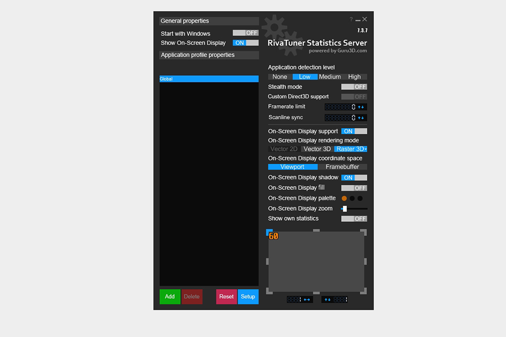 마지막으로 트레이에 숨어 있는 Riva Tuner Statistics Server를 선택하고 오른쪽 아래를 확인해 보면 On-Screen Display zoom을 이용해서 화면에 표시되는 프레임 폰트의 크기를 변경할 수 있고 아래쪽 Show own statistics를 이용해서 폰트의 종류도 변경이 가능합니다.