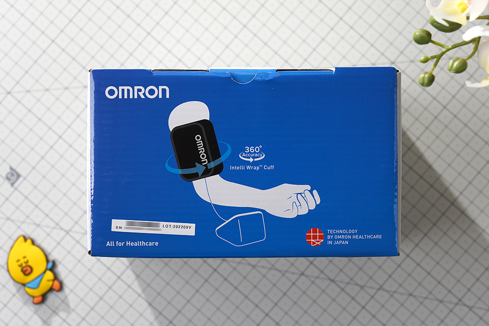 박스의 상단에는 오므론 HEM-7156 가정용 혈압계의 사용 방법이 간단하다는 것을 알려주는 일러스트와 함께 시리얼 넘버가 인쇄된 스티커가 부착되어 있습니다. 참고로 혼자 사용하는 경우가 많은 제품이라서 가능하면 착용과 측정이 간편한 제품을 커프형 제품을 선택하는 것이 좋습니다.